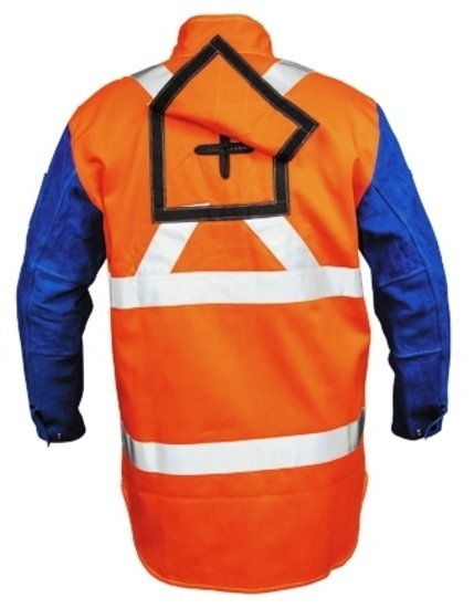 SIZE 2XL  WHY CHOOSE ‘PROMAX BLUE’ FR WELDERS JACKETS ? > Lighter & Cooler than Full Leather, with Leather Sleeves