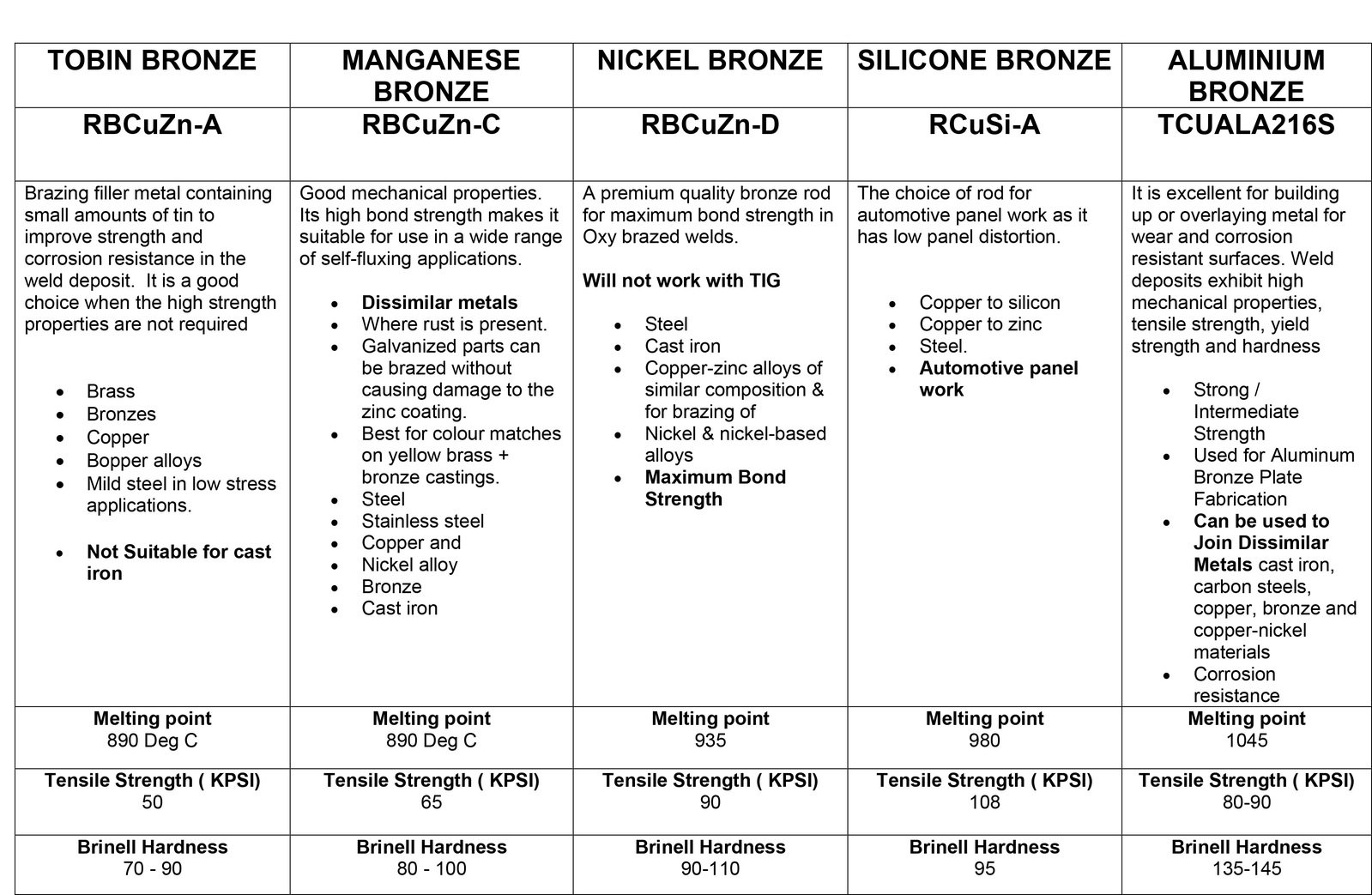 A premium quality bronze rod for maximum bond strength in TIG or Oxy brazed welds on of brass & bronzes. Also used for copper & copper alloys, & brazing to mild steel in low stress applications.
