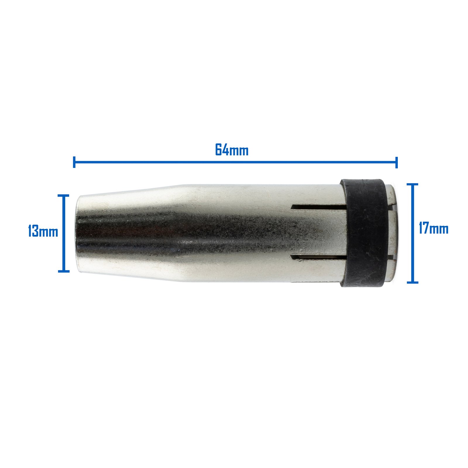 Binzel Style MB24 MIG welding conical nozzle is used for the Binzel MB24 MIG torch. These gas shrouds or nozzles are an important part of the MIG torch. The Binzel MB24 nozzle directs the inert shielding gas onto the weld pool, preventing contaminants from entering the weld and decreasing the likelihood of porosity in the finished weld. A number of shaped nozzles are available to suit the application. The most common nozzle, the conical shape accelerates the shielding gas into the weld pool with less turbulence than other shape shrouds.